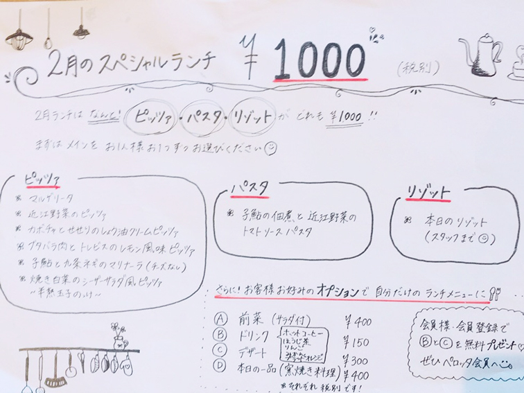 ピザ、パスタ、リゾットがどれでも¥1000!