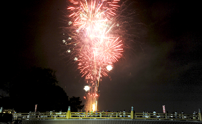 船幸祭は日本武尊が船団を従え、海路をたどられた故事に基づき執り行われる建部大社の夏祭りです。 瀬田川を海路に見立て船渡御が再現されます。大神輿を載せた御座船を先頭に、船団は約4キロ下流の御旅所 がある、黒津浜(供御の瀬)へと向かいます。 到着後、古式の則って別宮の毛知比神社・新宮の新茂智神社から神饌が献じられます。 ライトアップされた光が川面に映り、幻想的な夕暮れのなか御旅所祭が厳粛に執り行われます。 午後7時再び船団は帰路瀬田浜へと向かい、唐橋に近付くころ夜空に花火が打ち上げられます。 大神輿の動きに合わせ打ち上げられる花火がみどころです。