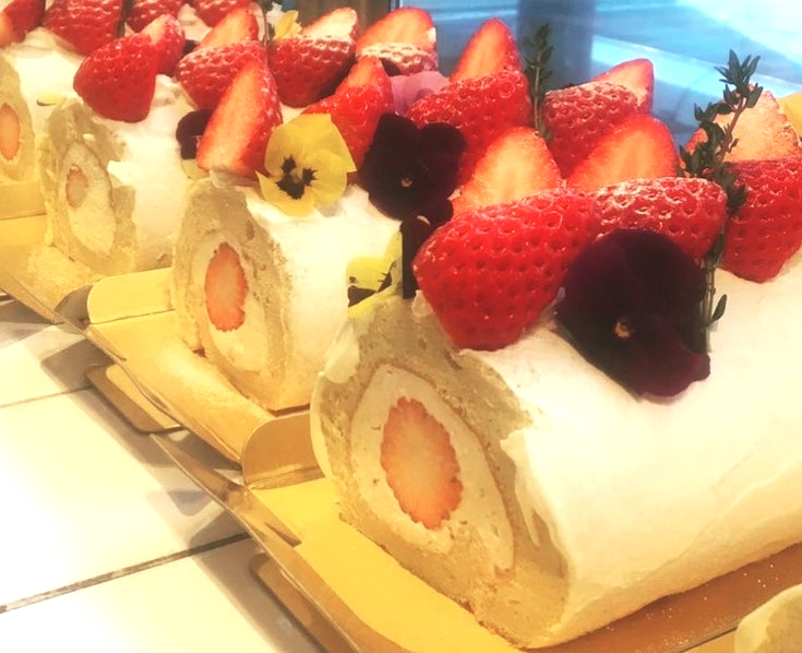 《草津のいちご農家、こはる農園さんの完熟いちごをコンフィチュールにして生クリームに混ぜ込みました。さらに、甘~いフレッシュいちごはトッピングに。生地には和三盆を使用し、フワフワ食感で上品な甘さの特製ロールケーキ 》