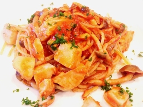 秋鮭としめじ、里芋のトマトソースのパスタ