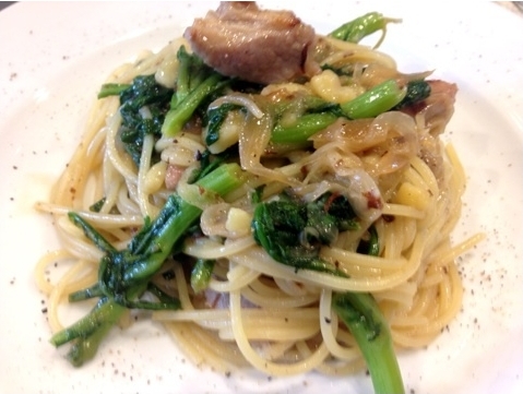 新メニュー 豚肩ロースと栗、春菊のオイルパスタ♪ タグ:パスタ オイルパスタ 豚肩ロース 栗 春菊 2014-10-16 09:00:00 こんにちは! 室内に居るのが勿体ないぐらい、いい天気です! 秋パスタ、第…何弾? ^_^; 豚肩ロースと栗、春菊のオイルパスタ シンプルですが豚の旨み脂と春菊が絶妙のハーモニーを奏でております。 相性って大事ですね(^^)/