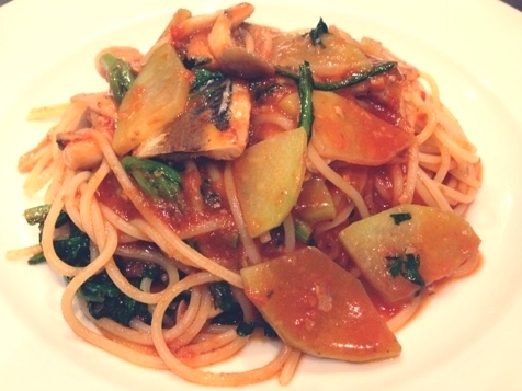 イワシとしめじ、春菊、隼人瓜のトマトソースのパスタ♪