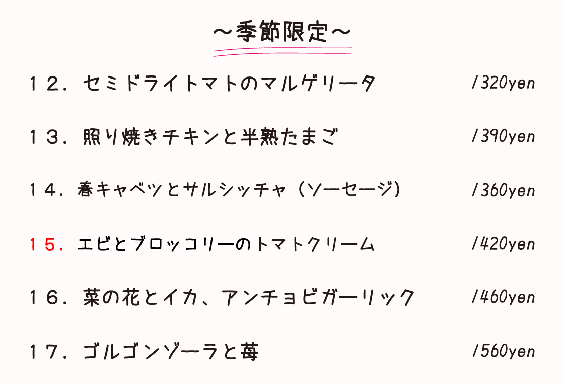 2つの味を楽しめるハーフ&ハーフもご用意しております。(値段の高い方のピッツァに+200yen)↓クリックすると別ページで拡大できます。
